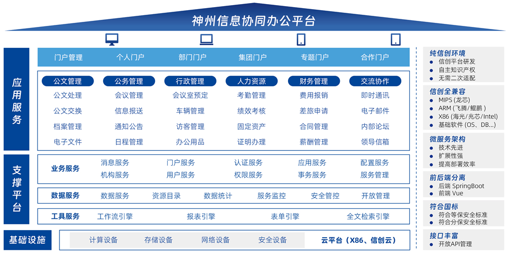 基于微服务应用架构设计的一体化办公平台,采用前后端分离的开发模式,支持在龙芯、鲲鹏、飞腾、兆芯等芯片的国产服务器安装部署,能够为企业提供丰富的协同功能应用,满足客户多样化、场景化、个性化的应用需求,助力中大型与集团企业客户实现数字化转型升级。