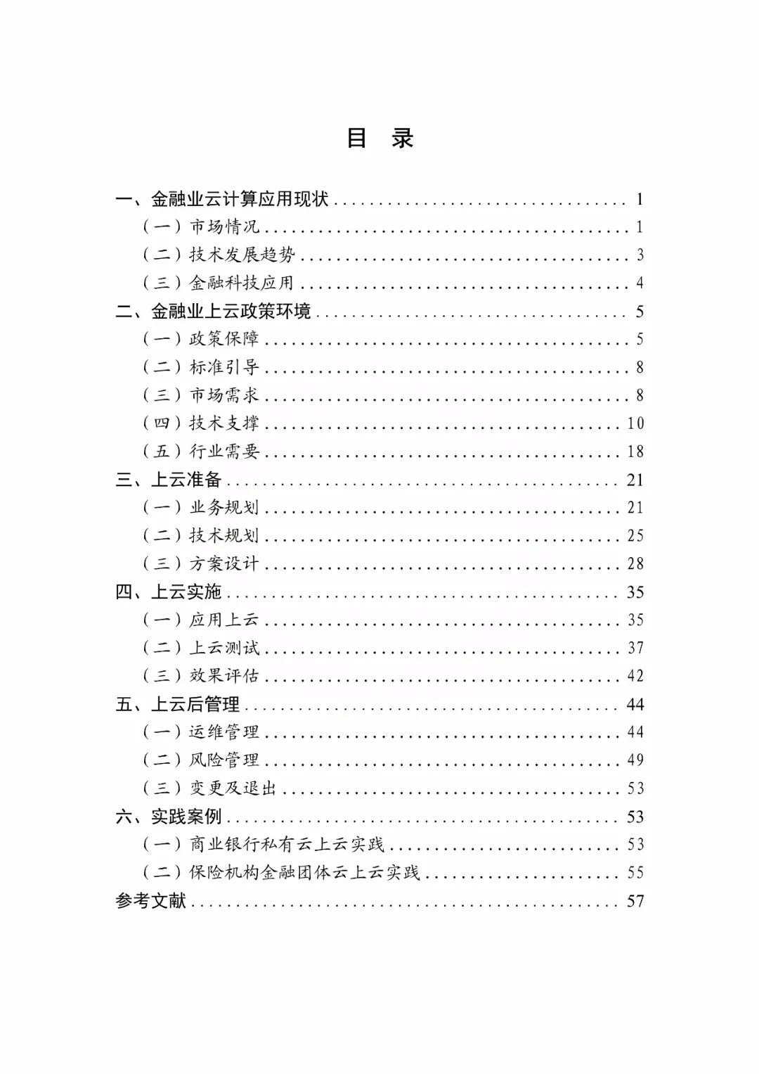 本报告从云计算应用现状、金融业上云政策环境、上云准备、上云实施、上云后管理等方面进行了梳理,结合金融行业监管要求及金融机构规模,分析了上云形态,整理了金融业上云实践经验,为金融机构业务云化转型提供参考。